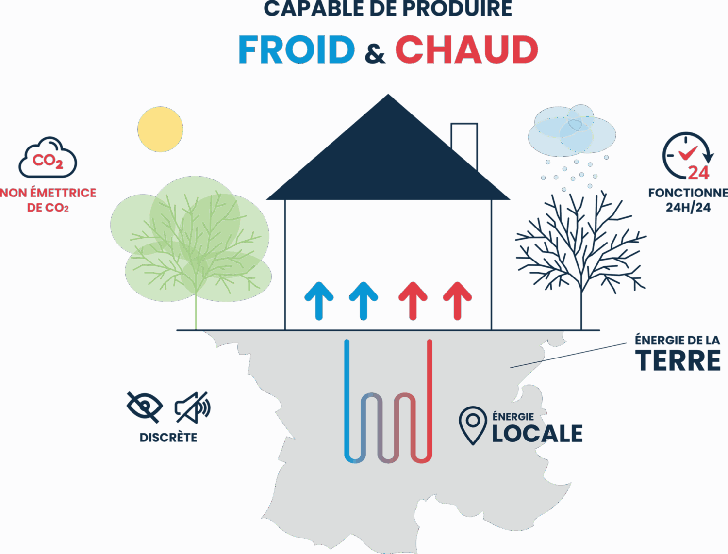 Permet de délivrer une énergie continue en chauffage et rafraichissement, convient pour tout type de projet avec des besoins stables.